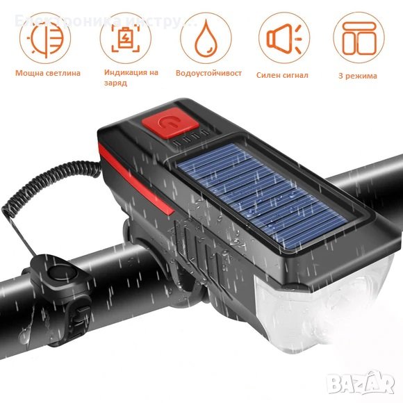 Соларен фар за колело с мощна светлина и клаксон