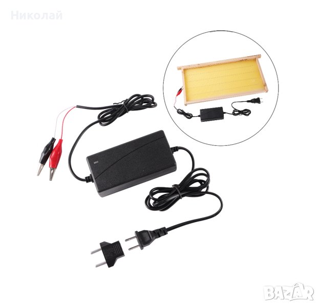 Ел. устройство за лепене на восъчни основи 12V , 5 A . Адаптерът служи за лесно и здраво закрепване на восъчни основи към телта на пчелни рамки . Компактни размери , дължина на кабела е 115 см с две щипки.