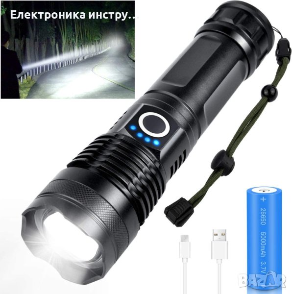 Мощен LED презареждащ се фенер с много здраво тяло от алуминиева сплав и дизайн против приплъзване. Дисплей за капацитета на батерията, телескопично увеличение. Обхват до 500 метра и водоустойчивост! Презареждащи се батерии! 180 лумина светлинен поток!