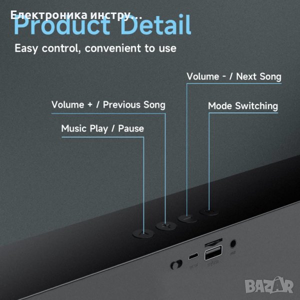 Удобство на една ръка разстояние: Специално проектиран с мисъл за използваемостта, този саундбар приема независим дизайн на бутоните. Бутоните са удобно разположени в горната част на звуковата лента за лесен достъп и безпроблемно управление.