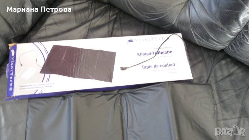 Подложка за стъпване с вграден радио звънец и аларма. Върху нея се поставя постелка, за да не се забелязва. Когато човек не знае и стъпи върху нея се включва алармената функция. Упътване има на кутията - немски и френски език. Закупена е от Германия, но е нова.
