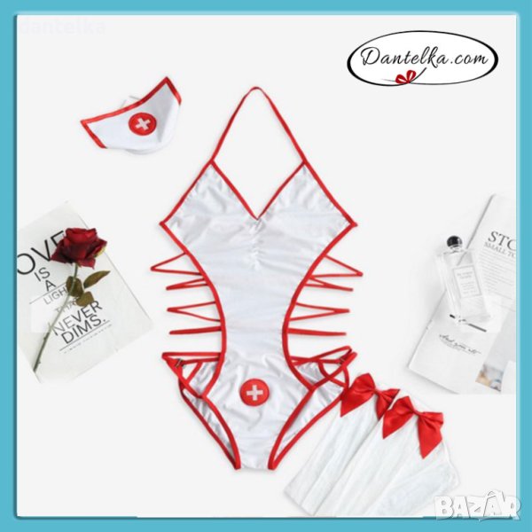 Еротичен костюм който седи точно по тялото. Секси комплект, който подчертава перфектно фигурата ти и няма да остави равнодушен нито един от силния пол! Комплектът се състои от три части - касинка, костюм и чорапи. Сексапилен костюм на медицинска сестра, който дава поле за фантазия на мъжете. Може да избереш елегантна комбинация с високи токчета (за още по-голям ефект). Високият ток подчертава женствеността и променят походката и самочувствието. Секси модел с отворен гръб, който предава чувствен и нежен вид на всяко момиче, така че не се колебай да ги използваш като притегателна сила за мъжете!