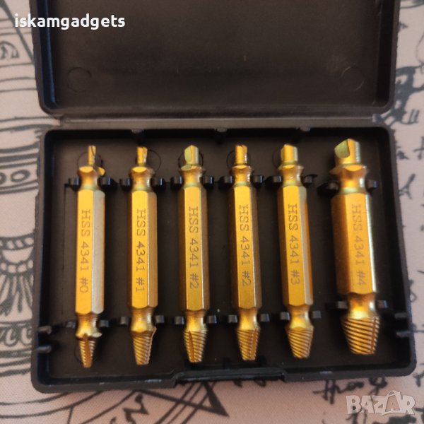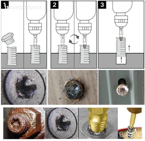 Най-накрая има евтино и добро решение за изваждане и развиване на скъсани, изядени, изпилени, счупени и повредени винтове и болтове! Цялата процедура отнема до 10 секунди! Най-лесно се получава, ако се използва винтоверт или акумулаторна отвертка. Комплектът работи като бургия и винт (шпилковадач) на обратна резба от рода на speedout. Инструмента е познат като Screw extractor, damaged bolt remover. В много удобна и компактна кутийка.