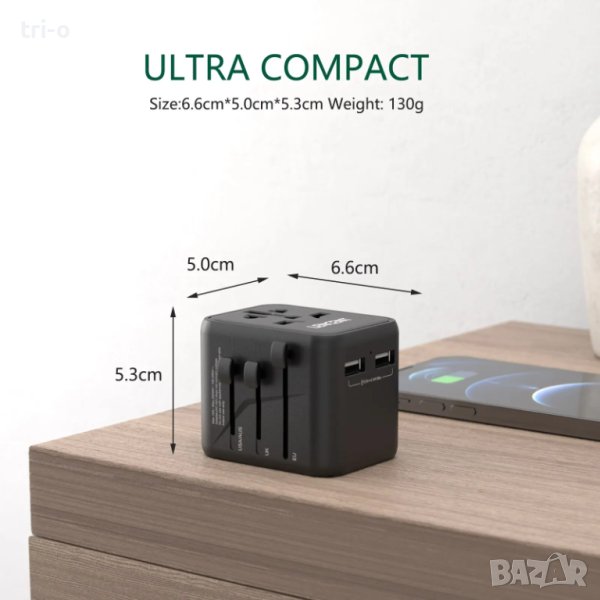 • Двойни USB портове: Зареждайте две устройства едновременно с двата USB порта на адаптера.
