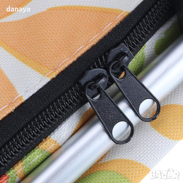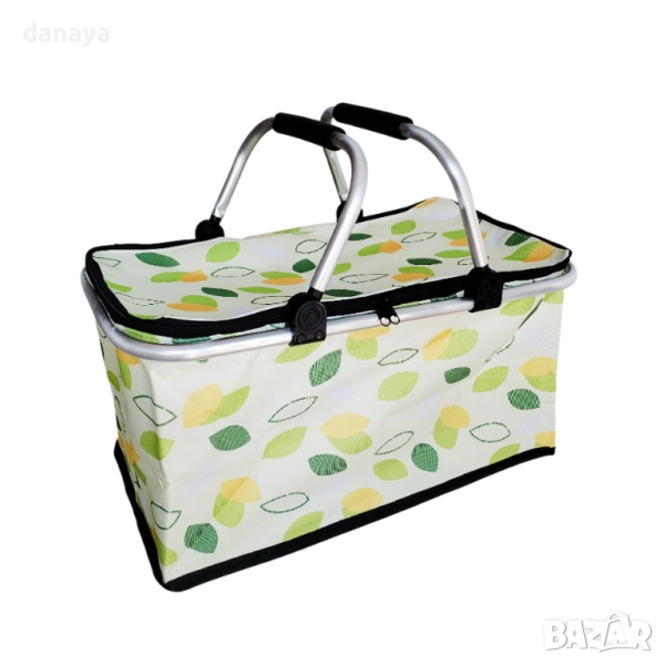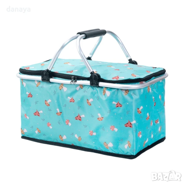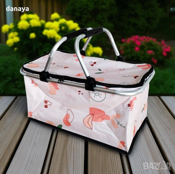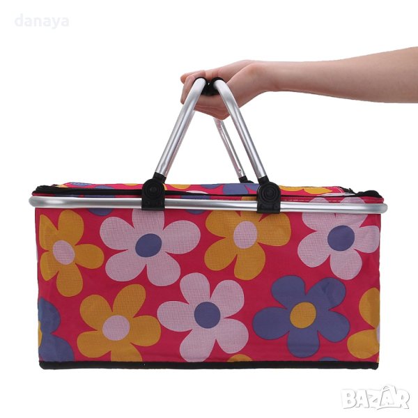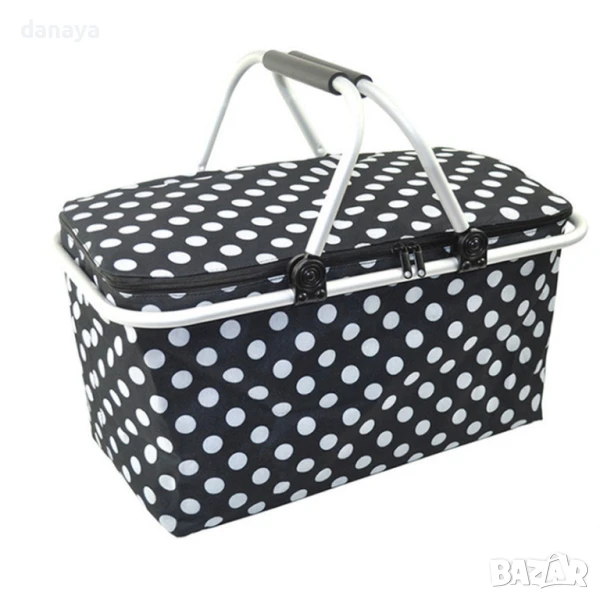 Сгъваема хладилна кошница за пикник. Голяма термо чанта, идеална за разходка сред природата, плаж или къмпинг. Има удобни алуминиеви дръжки, здрава метална конструкция и изолиращо вътрешно покритие от светлоотразително фолио. Вътрешното термопокритие на кошницата поддържа еднаква температура за продуктите, които слагате в нея. Студените ще си остават студени, а топлите- топли. Удобен капак с два ципа. Дръжките на кошницата са алуминиеви, материалът – непромокаем, цветовете модерни. Капацитет около: 30литра. Предлага се в различни разцветки.