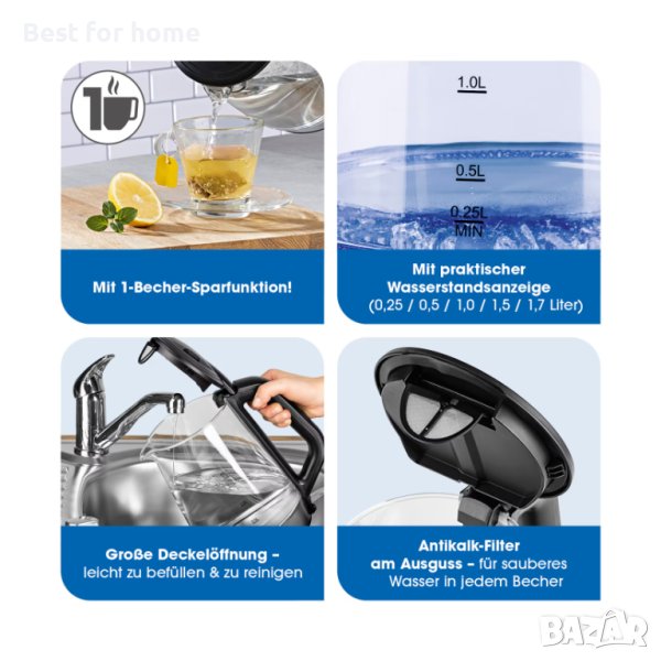 С практичен индикатор за нивото на водата (0,25 / 0,5 / 1,0 / 1,5 / 1,7 литра)