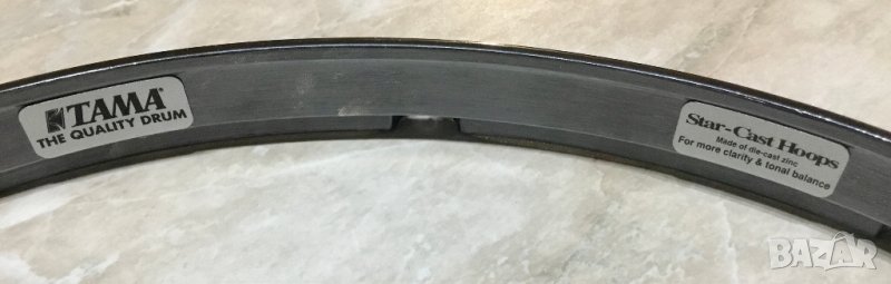 Die-cast hoops / лети обръчи за 14" барабанче с 10 лъга. Горният е бял, мисля че от Томан го купих. Долният е тъмен (на Тама черното, cosmo black ли му викаха), купен от МЦИ. Според инфо в нета реално са едно към едно като изработка и качества със съмнения, че ги правят на едно и също място. Те така си и звучат :)