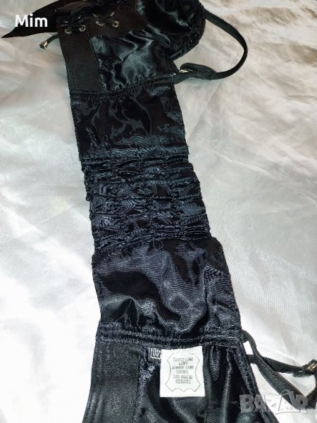 Черно кожена бюстие от естествена кожа с цип отпред отзад с ластик отпред с капси с шнур за регулиране на размера по тялото, чашката е твърда отговаря на чашка В регулируеми презрамки, подгръдна от 80 до 90 см еластичност. Няма забележки.