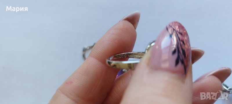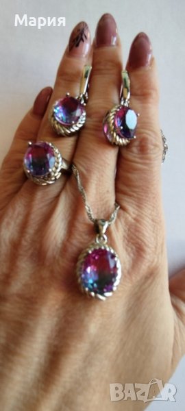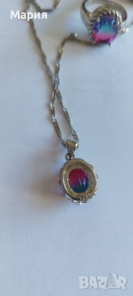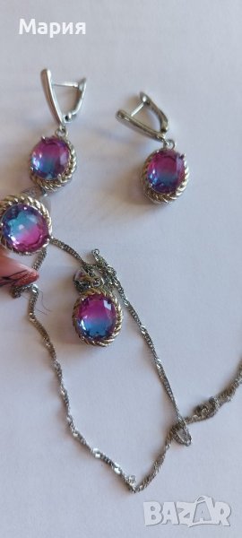 Красив и елегантен сребърен комплект, състоящ се от сребърни обеци, синджир, висулка и сребърен пръстен с многоцветен кристал, печат 925.