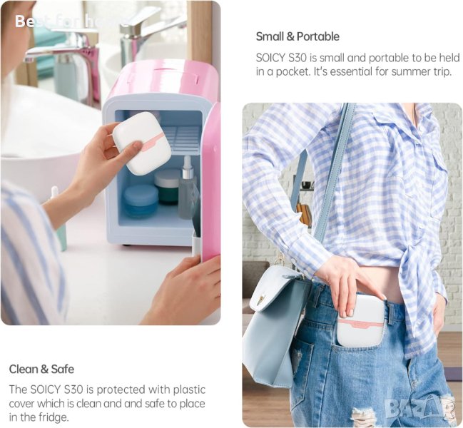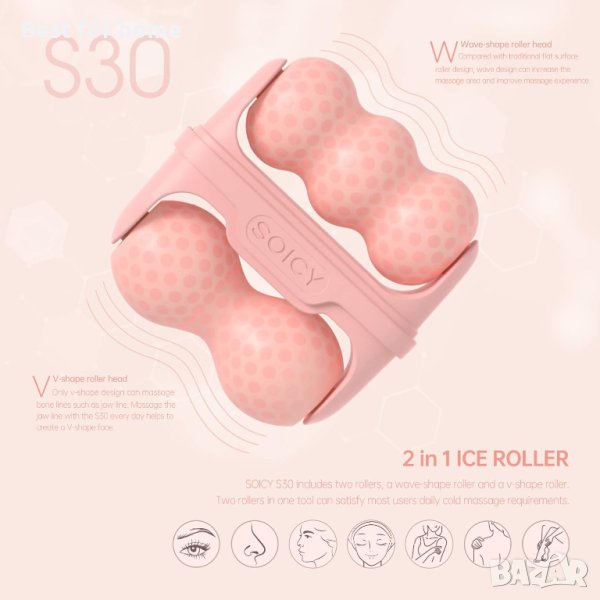 ОБЛЕКЧАВА КОЖНИТЕ ПРОГНОЗИ - SOICY S30 е студен масажор за намаляване на вида на кожни проблеми като слънчево изгаряне, умора, подпухналост, зачервяване и раздразнение.