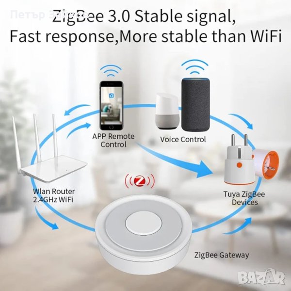 ZIGBEE Gate: ZigBee hub е необходимо устройство за всички ZigBee смарт устройства, което е по-стабилно и сигурно от използването на Wi-Fi система. Забележка: Smart Hub е съвместим само с интелигентни домашни устройства Tuya ZigBee и трябва да се свърже към 2,4 GHz WiFi честота (не 5 GHz).