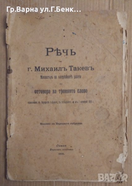 Реч на г.Михаил Такев Министър на вътрешните работи по отговора на тронното слово 1908г → Обява 43172176