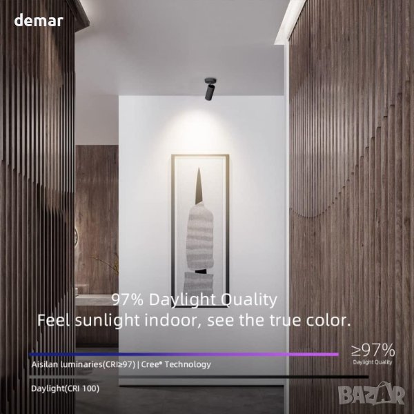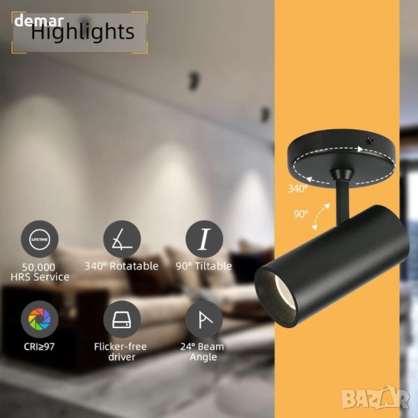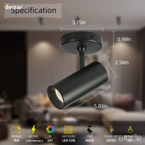 Въртящ се таванен прожектор – елегантен и издръжлив черен единичен прожектор, изработен от алуминий. Той предлага 340° хоризонтално и 90° вертикално завъртане, което ви позволява да персонализирате вашите светлинни акценти с прецизност. Този прожектор може да се похвали с висок CRI (индекс на цветопредаване) от ≥97Ra, осигурявайки естествено осветление без трептене. Той е оборудван с CREE LED COB чип, доставящ 12 W мощност, еквивалентна на 100 W халогенна светлина, с дълъг живот от 50 000 часа. Монтажът е безпроблемен, тъй като се доставя напълно сглобен с включени всички необходими части. Продуктът е предназначен за вътрешна употреба и е перфектен за различни помещения като дневни, спални, коридори, кухни и др.