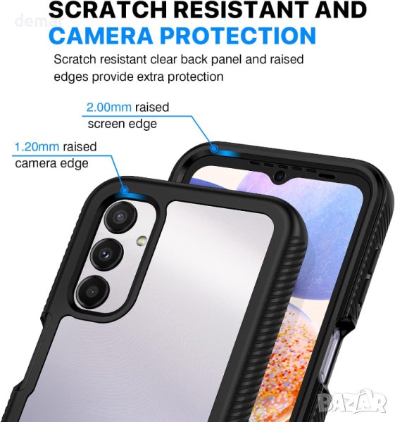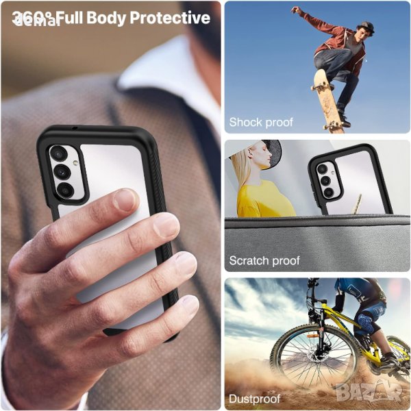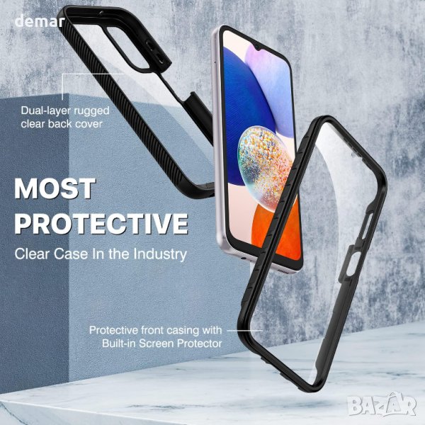 Samsung A14 4G/5G, като предлага сертифицирана MIL-STD 810G-516.6 защита и технология Air Cushion за удароустойчива защита на всички ъгли, идеален за употреба на открито. Осигурява 360° защита на цялото тяло с вграден HD протектор на екрана и прозрачен преден и заден корпус, изработен от TPU и поликарбонат (PC). Няма нужда от отделен протектор за екрана, тъй като прозрачният корпус предпазва от надраскване и счупване, като същевременно показва логото и цвета на телефона. Всички бутони и връзки остават лесно достъпни, с прецизни изрези за бутони, високоговорители, камери и интерфейси за зареждане. Тънкият дизайн предлага удобен захват и има дълбок изрез за камера за допълнителна защита на камерата.