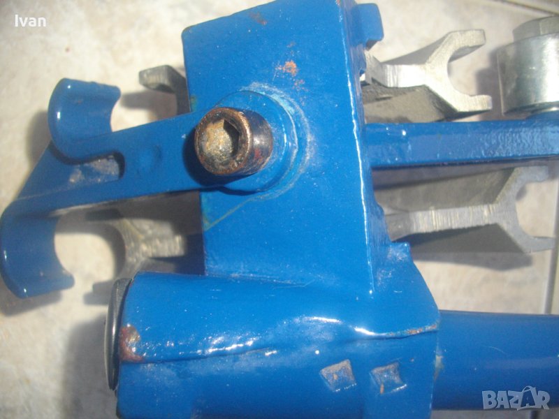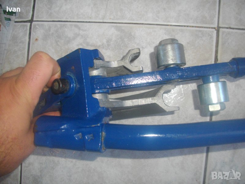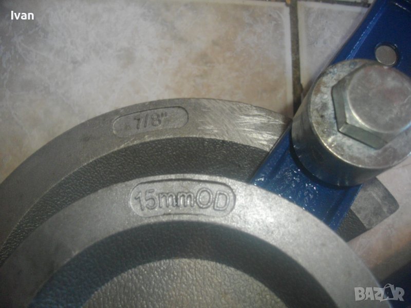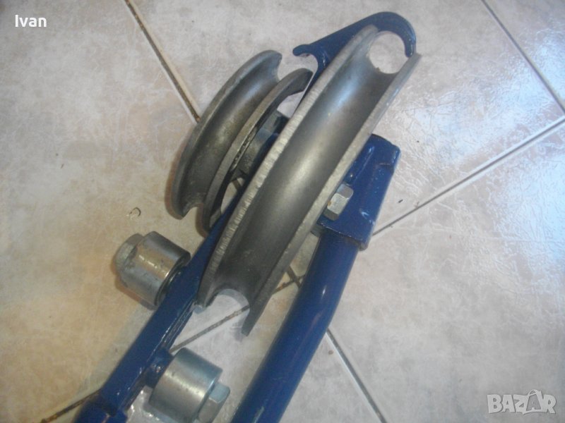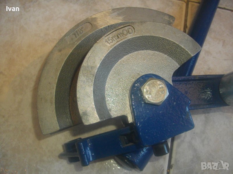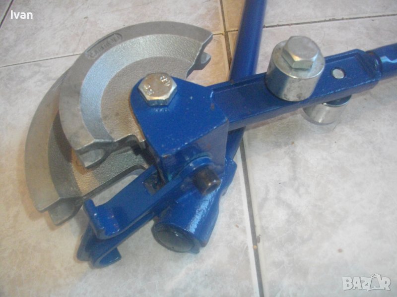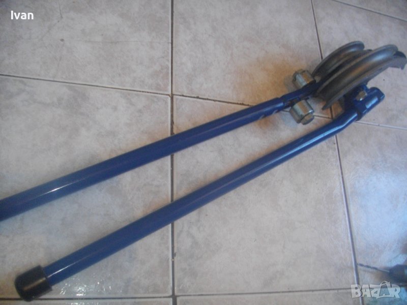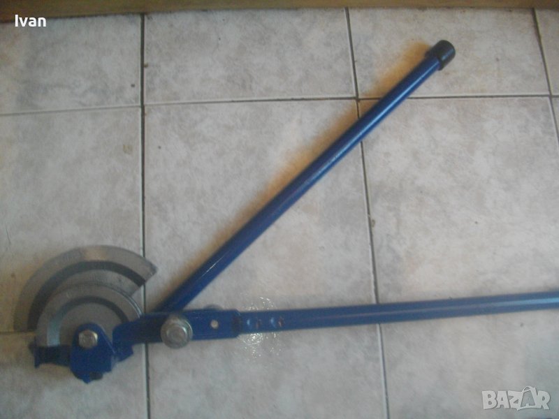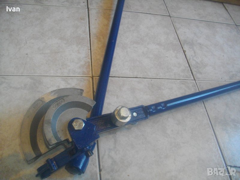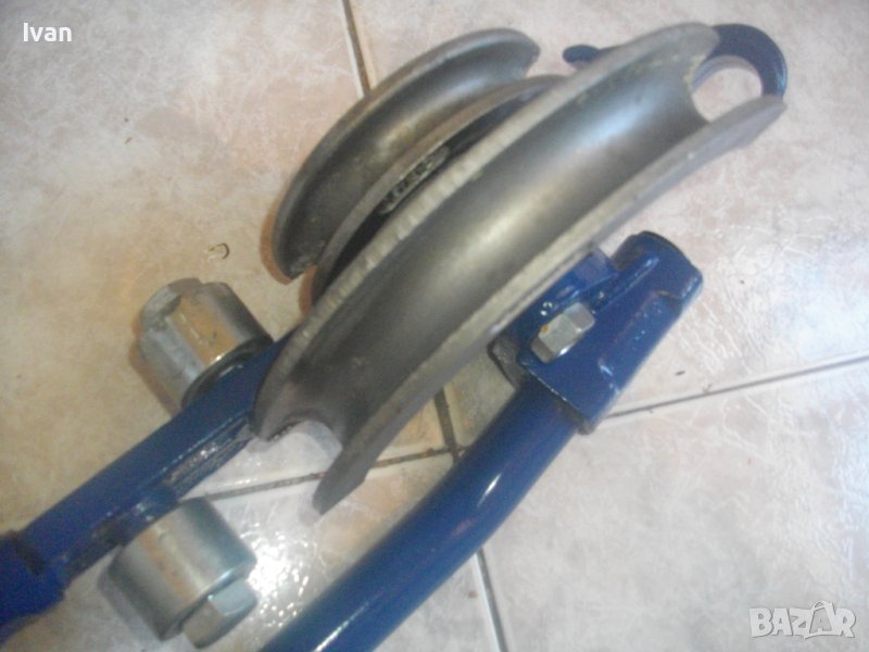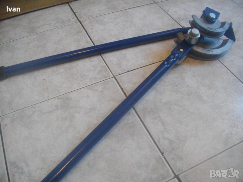 ОПИСАНИЕ на тръбогиб 15/22 мм - цена 259 лв. Уред масивен за огъване на меки, полутвърди и твърди тръби всякакви, включитено и стоманени. Немско производство, почти нов. Марка HBM. Масиивно дебело желязо за дръжки /кухи/ ф 25 мм с пластмасови капачки. Цялостна дължина на инструмента - 71 см. Двоен метален масивен водач с два размера 15 мм и 22 мм. Две отделни стоманени глави за огъване на тръби - рамери 15 мм и 22 мм. Добро тепническо раБотно състояние на тръбогиба. Два стаманени вътрящи се лагери. За прецизно постапенно огъване е нужно допълнително да се постави между огъващата глава и въртящия сее лагел към нея някаква метална пластина, която да притиска тръбата към жлеба на главата. Тегло на инструмента - 4,0 кг.