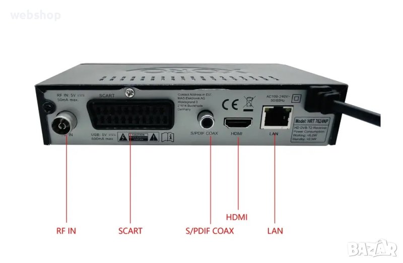- RF изходящ конектор x1 (IEC-TYPE, IEC169-2, мъжки(преходник)