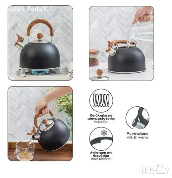 Чайник от неръждаема стомана, в черен цвят и бакелитна дръжка, която не нагрява. Има едно дъно за по-бързо завиране на водата, подвижен капак и автоматична свирка за удобна и безопасна употреба.