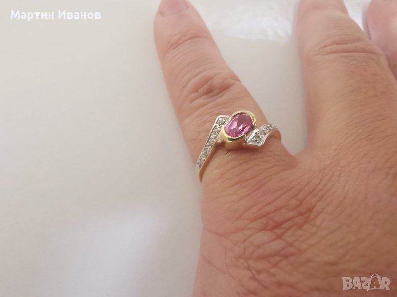 Златен пръстен с розов камък и циркони, 18к, 750пр, 2.80гр, вътрешен диаметър 17мм, размер 54 мярка