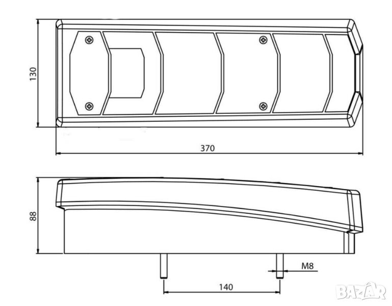 дължина - 370 мм; височина - 130 мм; дълбочина - 88 мм