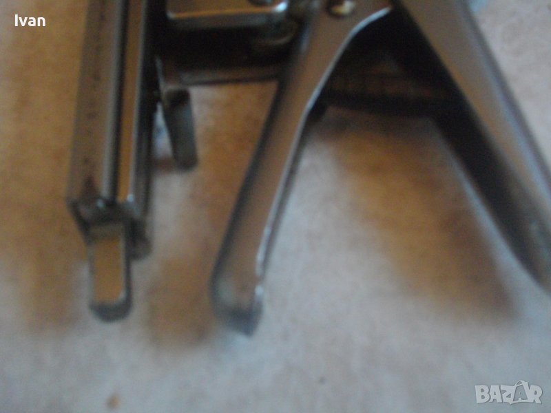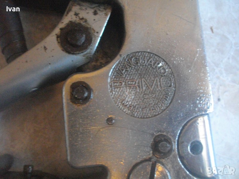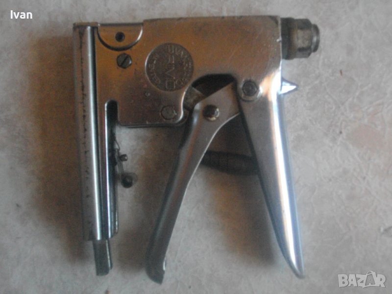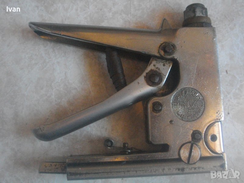 ОПИСАНИЕ на ръчен английски професионален такер дърводелски/тапицерски. Винтидж старо качество, оригинално английско. Винтидж инструмент за работа, колекции и интериор. Марка и модел на такера - PRIMO №101. Професионален инструмент. Маркировки - PRIMO TACKER - Vanguard Patented. Vintage Primo Automatic Label Tacker in Original. Корпус изцяло стоманен с хромирано инокс неръждавейка покритие. Такера е в отлично визуално и техническо/работно състояние. За скоби/кламери размер до 12 мм ширина. Регулация на удара. С възвратна пружина на дръжката. Масивен инструмент с тегло 1,2 кг. Заредени в пълнителя оригинални скоби за проба и тест. Модела го водят автоматичен. Цената от 159 лв е крайна и твърда, не подлежи на коментар.