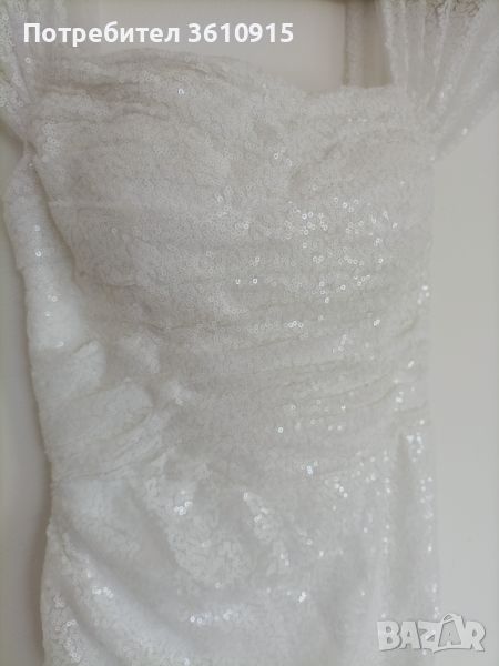 Дълга официална рокля с пайети и атрактивна цепка. Роклята е в бял цвят. Отвътре е с подплънки. Размер XS/S. Закопчаването е с връзки, което позволява допълнително регулиране на размера.