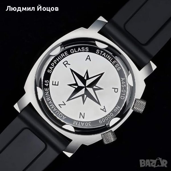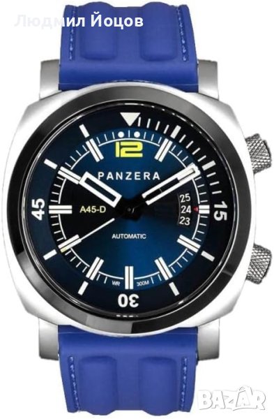 Часовникът за гмуркане PANZERA Aquamarine 45D е зашеметяващ часовник, който съчетава майсторска изработка и производителност. Той е създаден за гмуркане, включващ водоустойчивост 300M/30ATM, устойчиво на надраскване сапфирено стъкло и въртящ се вътрешен панел за гмуркане, управляван от специална отделна завинтваща се корона за показване на изминалото време, прекарано под вода. Той се захранва от доказан, точен и здрав автоматичен механизъм Seiko NH35 и ясен голям циферблат със светещи стрелки и маркери, които го правят лесен за четене при всякакви условия на светлина. Той също така идва с богат избор от гумени, метални и естествени кожени каишки с бързо освобождаване, които могат лесно да се сменят, за да отговарят на вашия стил. PANZERA Aquamarine 45D е часовник за гмуркане, който е еднакво у дома над и под океана.