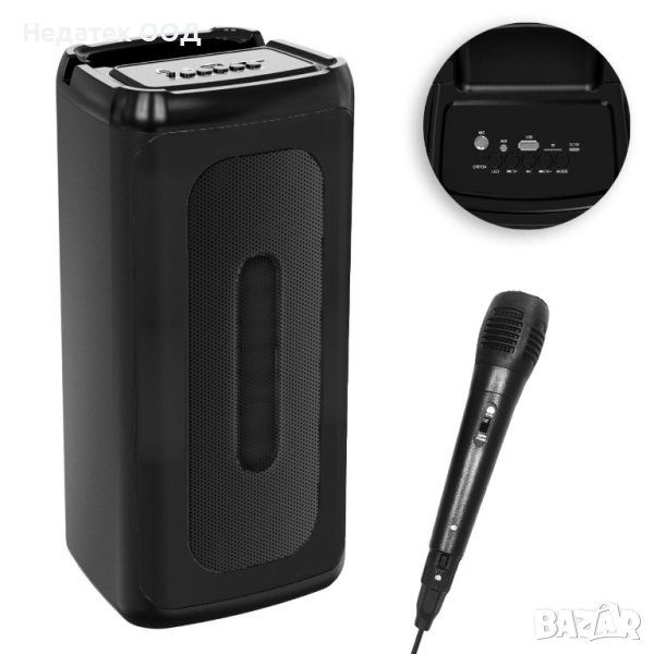 20W Bluetooth високоговорител, SD/TF порт, USB, FM, TWS, Aux жак, жак за микрофон и 2400mAh литиево-йонна акумулаторна батерия.Има работен обхват от 10 м без препятствия, време за зареждане от 2-3 часа за време на възпроизвеждане от 4-5 часа (70% интензивност).Има led осветление.