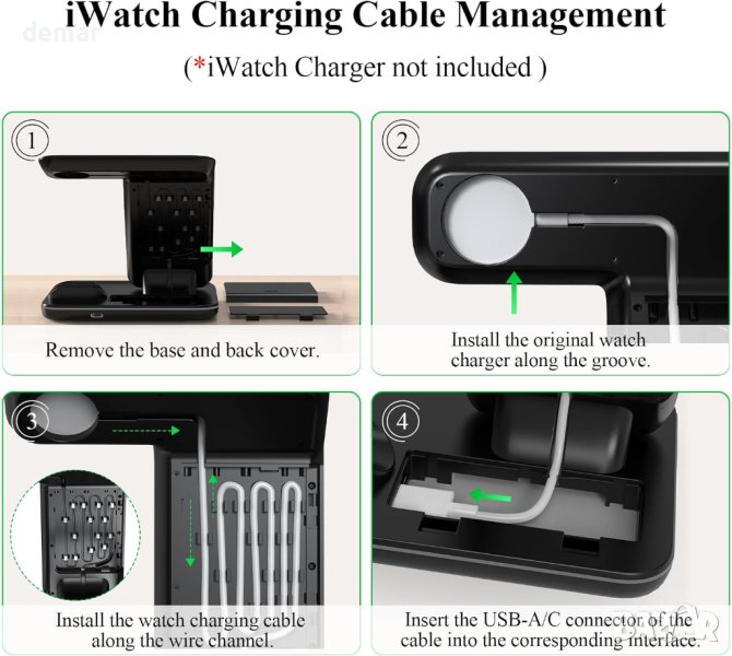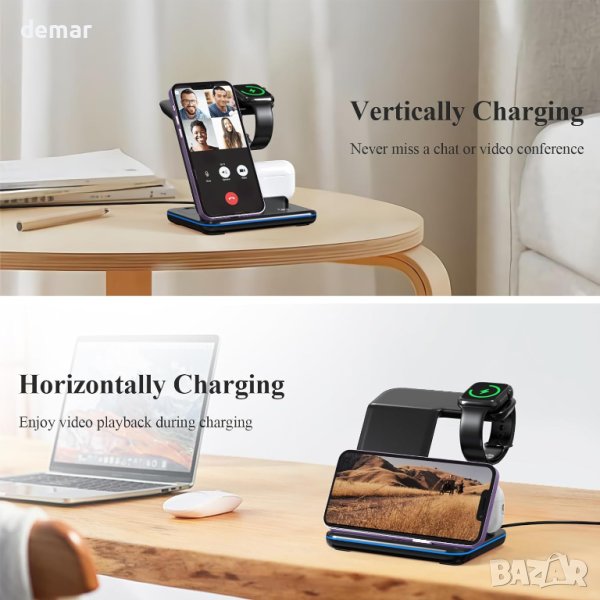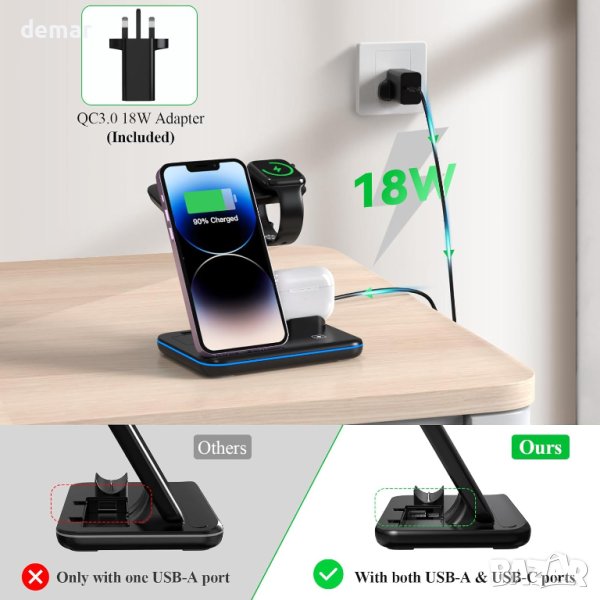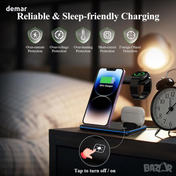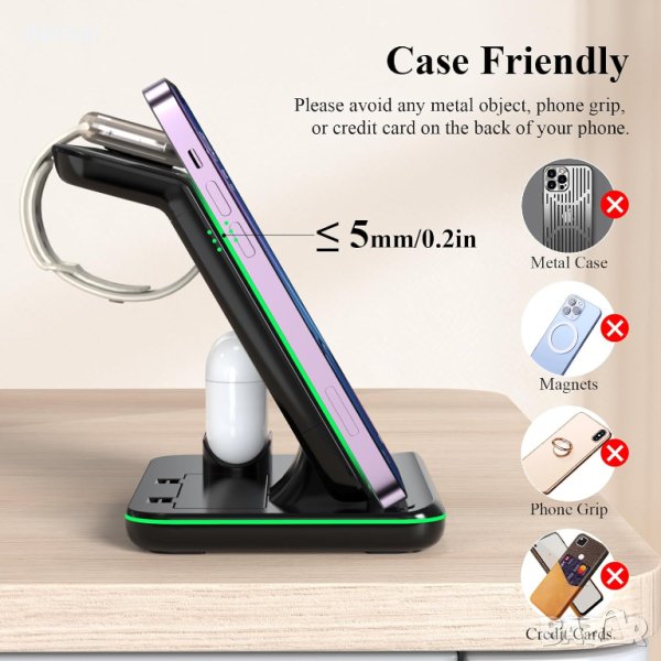 „Поставката за безжично зареждане 3 в 1“ е универсално зарядно устройство, способно да зарежда бързо три устройства едновременно, елиминирайки необходимостта от заплетени кабели. Той е универсално съвместим с различни модели iPhone (от iPhone 14 до iPhone 8), iWatch Series Ultra/SE2/8/7/6/SE/5/4/3/2 и AirPods Pro2/3/Pro/2/1. Трябва да се отбележи, че не е подходящ за телефони без Qi, часовници или слушалки на други марки. Стойката включва QC3.0 18W бързо зарядно устройство, предлагащо до 15W за телефони, 2W за слушалки и 2,5W за зареждане на часовник. Той е Qi-сертифициран с множество мерки за безопасност като защита от свръхток, пренапрежение и прегряване, подкрепени от сертификати като CE, ROHS, FCC, UKCA. Интелигентната дишаща светлина показва състоянието на зареждане и е проектирана да не пречи на съня, с опция за изключване. Зарядното побира калъфи за телефони с дебелина до 5 мм. Имайте предвид, че оригиналното магнитно зарядно за iWatch не е включено.