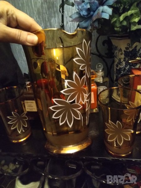 Цветен кристал "КЕХЛИБАР" с позлата(матова и ярка ) ,сервиз за вода ,безалкохолно ,вино или каквото решите ,ръчно изработен и рисуван от началото на 70 те години .Състой се от 6 чаши и огромна кана ,вместимост чаши 200 мл ,кана 2.7 литра.НЕ Е ПОЛЗВАН ОСВЕН ВЪВ ВИТРИНА .КРАЙНА ЦЕНА