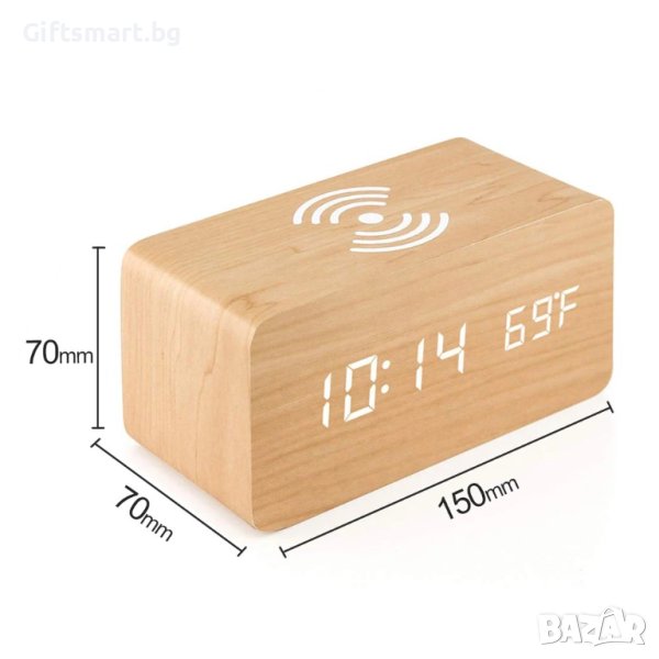 часовника. Спецификации:Размери: 15х7х7смТегло: 300грМатериал: МДФ+ПВЦЦветове: Бакмук/БялБезжично зареждане: 5W Комплекта включва:1.Часовник2.Инструкции за ползване3.Кабел