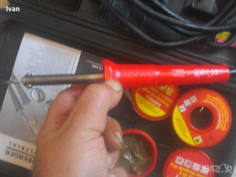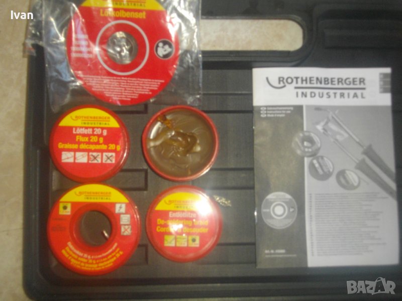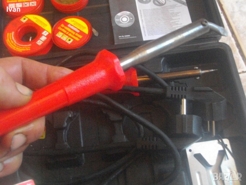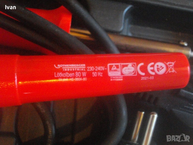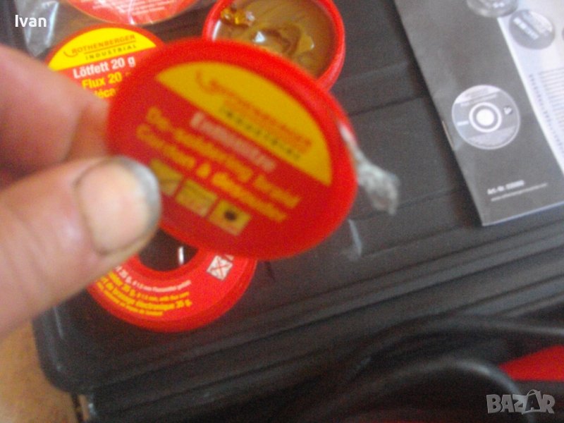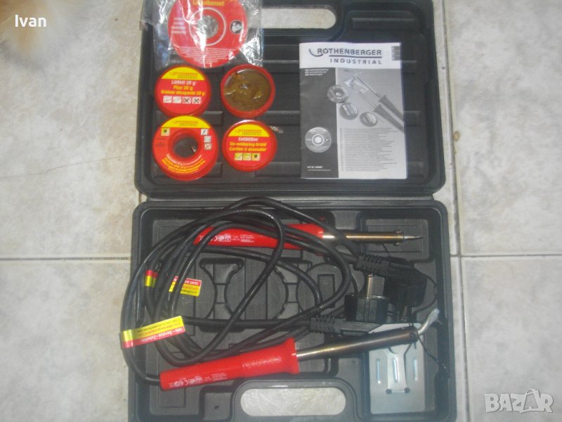 ОПИСАНИЕ на комплект 2 р. ел. поялници Ротенбергер. Марка и модел - Rothenberger Industrial Производство 2021 г. оригинално немско - Deutschland. Комплеткът е професионален/промишлен/индустриален. И двата поялника са почти нови, ползвани 1-2 пъти. В отлично работно тъхническо състояние. И двата са маркирани с марката. Единият е с крива човка с мощност 80 вата и дължина 255 мм, човка дълж. 30 мм и ширина 5 мм. Другия поялник е с остър връх и мощност 25 вата, с дължина 210 мм. В комплекта е включена стойката метална за самостоятелен стоеж, 1 бр. ролка тенол на макара 35 гр х 1,5 мм, 1 р. за запойка многожична 1,5 м х 2,5 мм, 1 бр. кутия с колофон 20 гр. Налична оригиналната немска книжка с оригиналния диск DVD за видео преглеждане с инструкции за правилна употреба на комплекта поялници. Температура, развиваща се от поялниците - 185 - 235 градуса Целзии. Куфар - твърда пластмаса с вградена дръжка и лого на марката. Размери на куфара - 285 х 200 х 55 мм. Тегло на комплекта - 1,5 кг. Цената е твърда и без коментар - 299 лв.