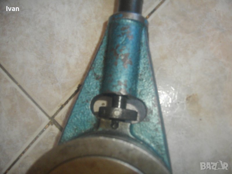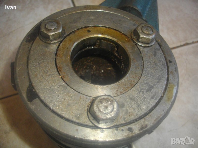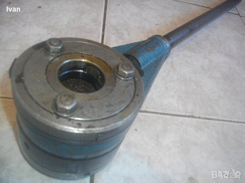 ОПИСАНИЕ на плашката - цена 298,99 лв / 152,87 евро. Унгарско старо качество от Соца. Съвсем нова, само е пробвана и профилактирана. Нов, здрав, качествен и истински инструмент, с който може да се върши работа. Винтонарезка/ плашка / винторезка/ пафта / винторезза направа на разби на тръби размер от 1/4 цол до 1 цол, в зависимост от поставен размер ножове. Инструментът се предлага с поставени 4 бр. оригинални ножове размер 3/4 - 1 цол В отлично визуално, техническо и работно състояние. Без забележки. Профилактирана, смазана и гресирана. Цялостна дължина с дръжката - 57 см, дължина дръжка 43 см, диаметър тръба дръжка - ф 25 мм. Тресчотъчна глава диаметър ф 100 мм, височина - 80 мм. Задно притягащо менгеме с 3 челюсти. Тегло на инструмеента с поставените ножове - 6,0 кг. Цена на резбонарезната винторезка с поставен 1 комплект ножове - описания размер 3/4"-1" - 152,87 евро/ 298,99 лв.