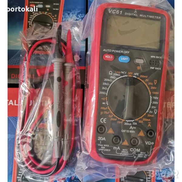мултицет мултиметър VC61 NCV / 20A / 200uF / 1000VПредназначение: Измервателен уред, цифровДоп. функции: NCV (NON-CONTACT VOLTAGE) безконтактно търсене на напрежениеЗахранване: 1 х 9V 6F22 батерия (вкл. в комплекта)Защита: Противоударен гумен калъфПроизход: КитайСтатус: НОВОЦифров измервателен уред, мултиметър VC61;Функция NCV за безконтактно търсене на напрежение;Ръчен избор на обхват;Тест на диоди.Тест на транзистори;Проверка на верига със звук;Автоматично изключване;Индикация за слаба батерия;Функция HOLD (задържане на показанията на дисплея);С подсветка;С вкл. професионални сонди в комплекта!Постоянно напрежение: 200mV -1000V ±(0.5%);Променливо напрежение : 2V-750V ±(1.2%);Постоянен ток: 200mA-20A ±(2%);Променлив ток: 20mA-20A ±(3%);Съпротивление: 200Ω-20MΩ ±(5%);Капацитет: 20nF-200µF ;Голям дисплей с разряд 3½;Максимално показание на дисплея: 1999;Висока Категория за безопасност и точност на уреда: CAT III;С противоударен гумен калъф ;Може да се вземе от място от гр.Карлово или гр.Пловдив, или да се изпрати чрез куриер!