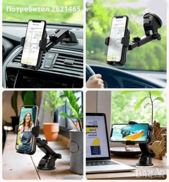 1 бр. Автомобилна стойка за смартфон, въртяща се на 360о с телескопично удължение, силиконово закрепване с вендуза;