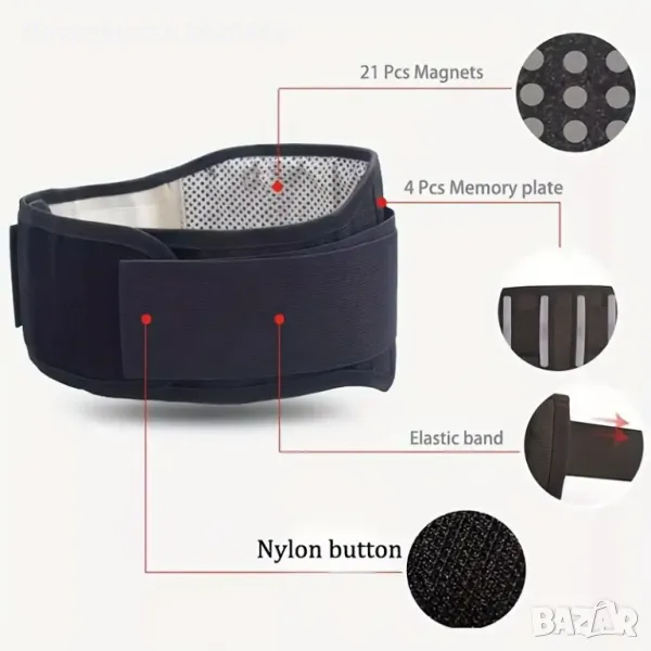 Коланът прилепва плътно около кръста, а вградените в него магнитни пластини поддържат кръста и гръбначния стълб в изправено положение.