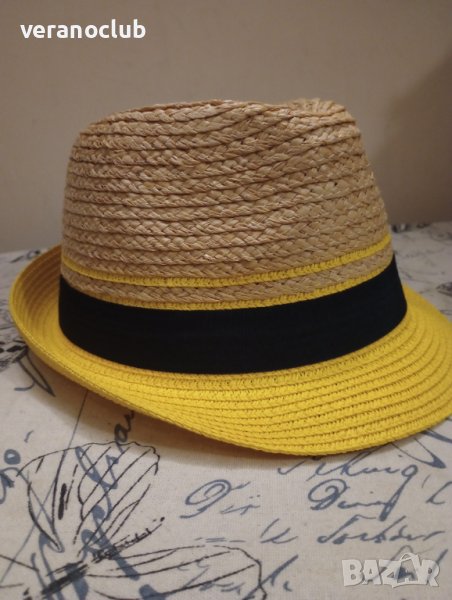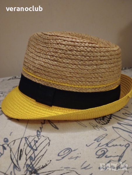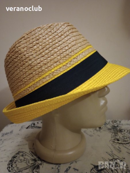 Страхотен универсален модел шапка бомбе от естествена мека и здрава трева в естествен цвят на сламата с добавена малка периферия в красиво жълто от хартиена слама.