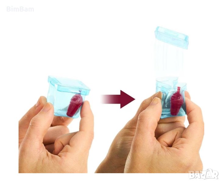 - Първо отстранете външния слой, който покрива кутията, отворете стъклото и извадете торбите с изненадите. След това завийте отново капака и залепете парчето във формата на сламка в него, за да освободите меката розова слуз. Вижте как покрива кубчетата лед!