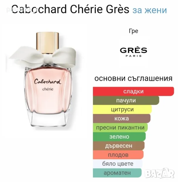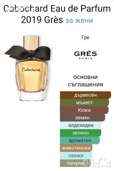 1️⃣. "Cabochard" de Gres / 100ml EDP. Стар бач код - D0B22. Цената е крайна 59,99лв / 30,5 евро. Дамски парфюм, невероятен шипров аромат от старата школа. Липсват няколко шпрея за проба, има чудовищен шлейф, но е много по-мек от EDT версията. Подходящ е за подарък, пълна презентация. Продавам го, защото се нуждая от парите. Информацията и ароматната пирамида са от Фрагрантика.
