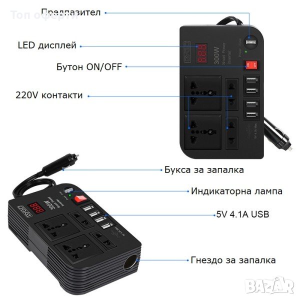 Инверторите осигуряват непрекъснато захранване на слаботокови устройства, преобразувайки напрежението в 220V AC или 110V AC, в зависимост от линейното напрежение на ответната страна. В конкретния случай става въпрос за инвертор от 12V на 220V, съответно входящо и изходящо напрежение с мощност 300W.