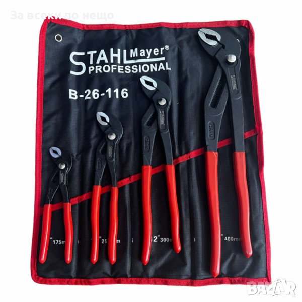Комплект клещи гарги STAHLMAYER се състои от 4 инструмента с дължина съответно 175/250/300/400 мм. Положението на челюстта се регулира с бутон, който осигурява фина настройка за оптимално адаптиране към детайли. Изработени са от хром-ванадиева стомана. Разполагат с неплъзгащи се пластмасови дръжки. Доставят се в полиестерен калъф.