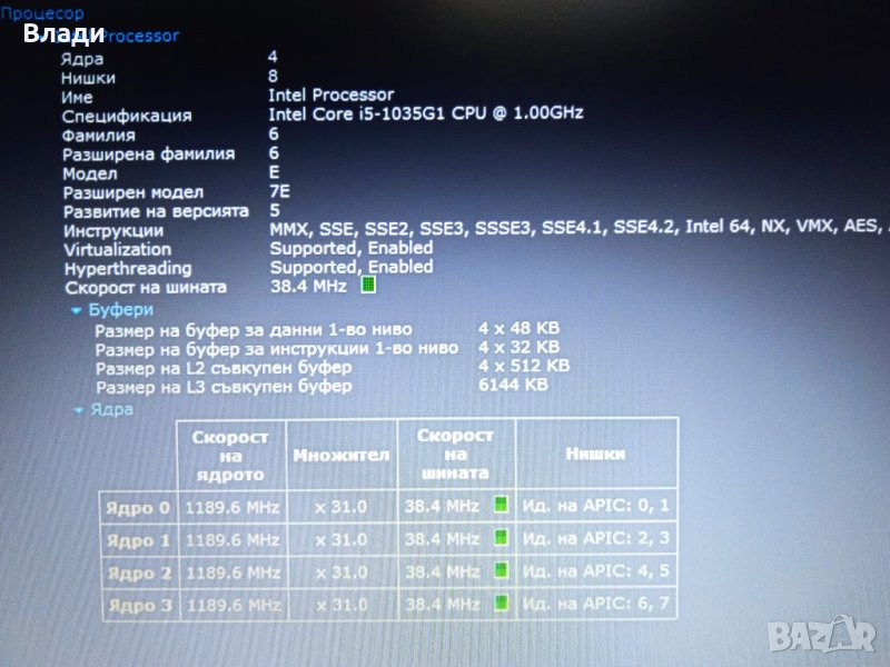 Процесор четириядрен Intel Core i5-1035G1 (1.00 - 3.60 GHz, 6 MB cache)