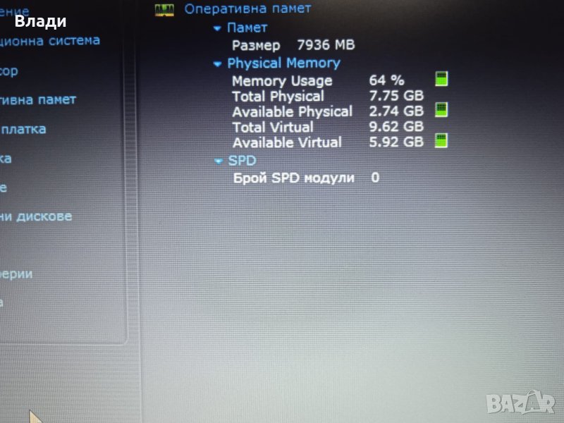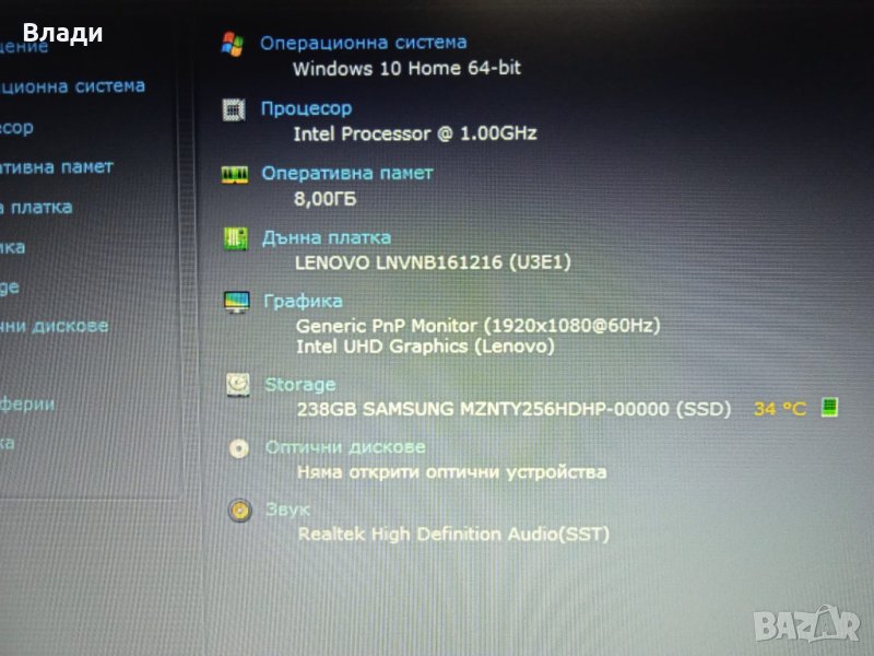 Инсталиран с Windows 64 bit,HDD Sentinel,Speccy и Aida 64,за да се тества преди да се плати.