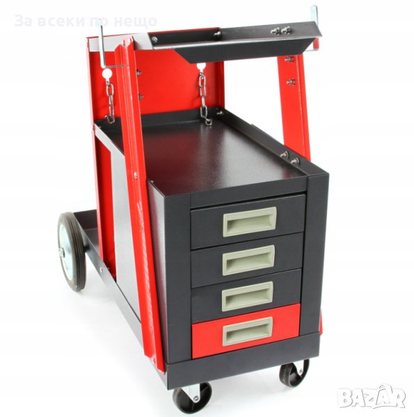 Количка за телоподаващи и аргонови / заваръчни апарати и електрожени MAR-POL M66612 с 4 чекмеджета. Оборудвана е с 4 колела, 2 от които са със спирачки. Газовата бутилка може да бъде поставена от задната страна на количката, която може да бъде сигурно закрепена с помощта на две вериги. Отгоре може да бъде разположен заваръчният апарат.