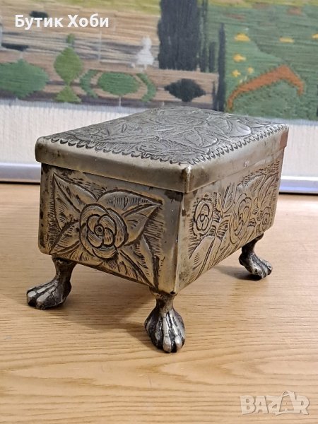 Старинна метална кутия/сандъче за бижута и др. Майсторска ръчна изработка от тежък метал (олово ? сплав ?) с орнаменти ,,Роза,, Обърнете внимание на ,,краката,, и ! :)
