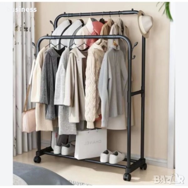 Двойно стояща закачалка за дрехи, за да се организират нещата. Има място за окачване на закачалки, свободни палта или якета и стойка за обувки.