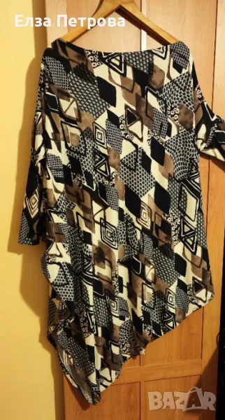 Асиметрична интересна туника/рокля на фигури в бежово, черно и кафяво → Обява 43245267