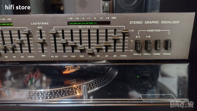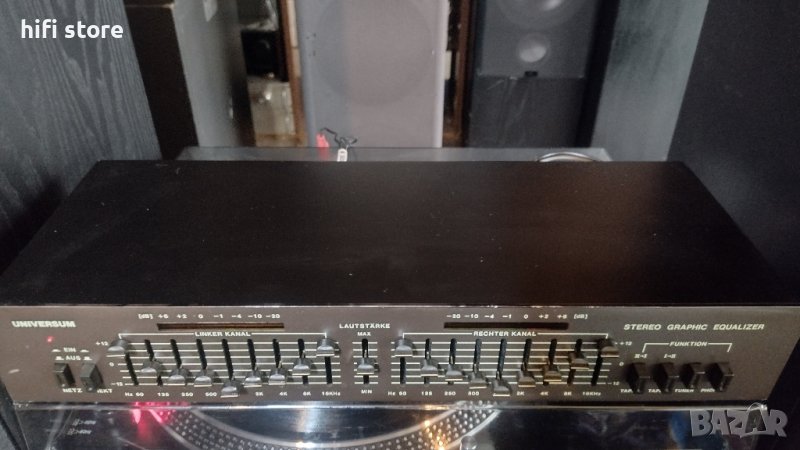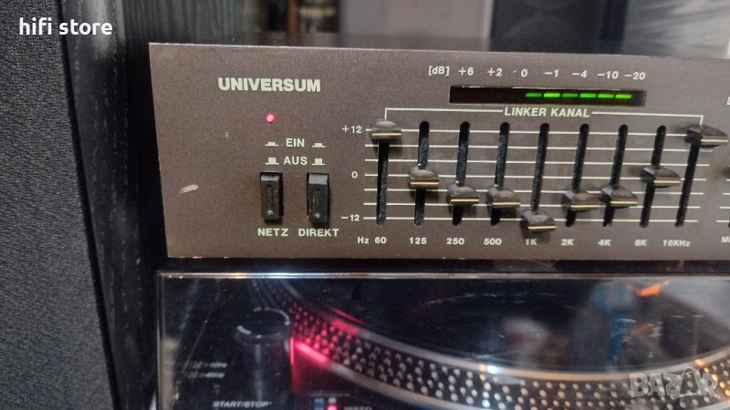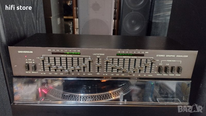 UNIVERSUM EQ-3930 – Предусилвател и еквалайзер,2 Х 9 канала. Преда е с четири входа – грамофон,тунер,тейп 1 и тейп 2. Прекрасно решение,ако усилвателя ви няма грамофонен вход,то тука има. Регулиране на силата с отделен плъзгач. Атрактивни LED индикатори. Изключване на корекциите.
