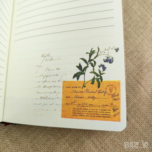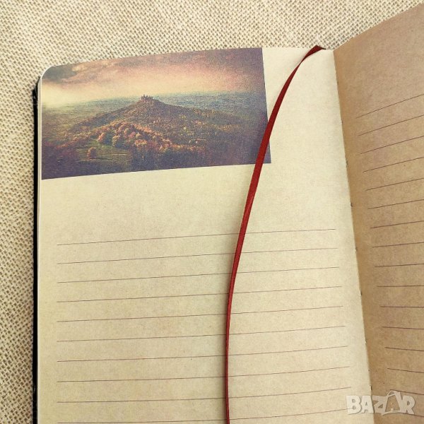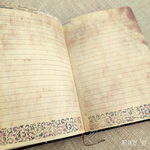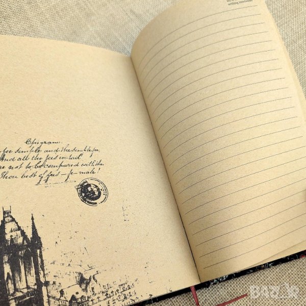 Тефтерът е с размери А5 (21 х 14 см). Твърдите корици са подвързани в