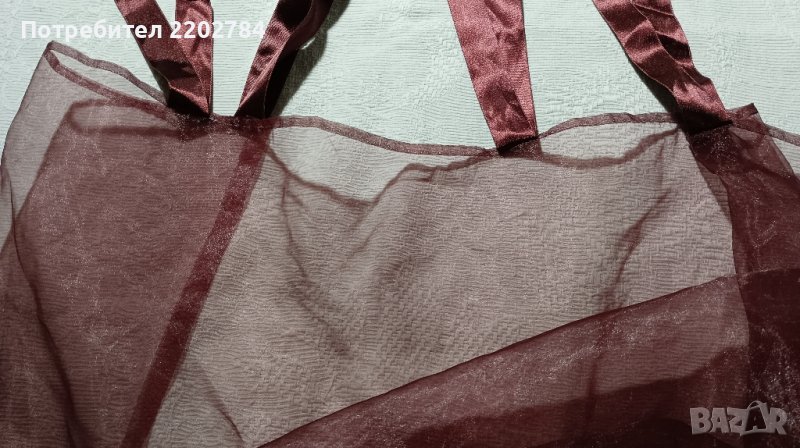 Трети са комплект от две пердета от органза воал в наситено бордо.Размер на едното - ширина 150см, дължина 220см без сатенени те панделки.Дължина на панелките 35см.Привързват се към тръбен корниз със сатенените ленти.
