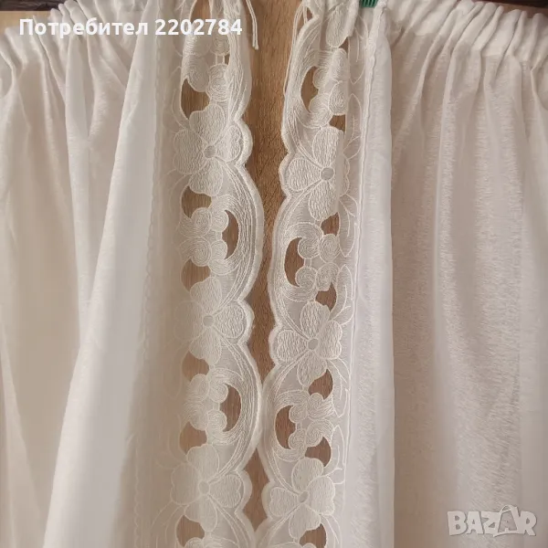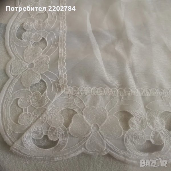 пердета са бели,комплект от два броя,с рязана бродерия по дължината и ширина. С перделик и с копчета за корниз,готови за поставяне.Размери на едното - ширина в горната част при перделика 90см, ширина в долната част 180см.Дължина 230см.Връзките на перделика са запазени и при желание може да се увеличи ширината в горната част.Без забележки.